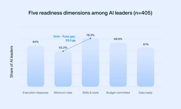 Onder AI-koplopers geeft 78% aan over voldoende AI-vaardigheden en -tools te beschikken, heeft 69% AI-budgetten toegewezen, en heeft 64% uitvoeringsmaatregelen ingevoerd.