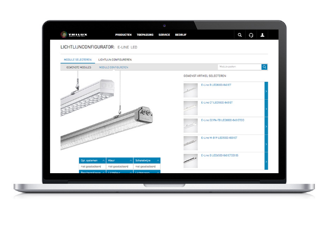 "De E-Line LED is de meest veelzijdige lichtlijn op de markt. Ze vervult praktisch elke verlichtingstaak – zij het in de industrie, in de detailhandel, in kantoren of scholen", zegt Klaas Keur, productmanager bij TRILUX. "We staan dicht bij onze klanten en hebben hun wensen goed in beeld. Dankzij onze eigen productie in Arnsberg is een op maat gemaakte E-Line oplossing, op basis van specifieke eisen van de klant en het project, altijd een mogelijkheid. In 2016 werd 40 procent als speciale uitvoering geleverd. Elke klant krijgt precies wat hij nodig heeft en wij krijgen nóg meer inzicht in de vereisten van de diverse applicaties. Dat nemen wij op onze beurt weer mee in het standaard productportfolio van de E-Line LED", voegt Keur eraan toe. TRILUX helpt haar klanten met de E-Line-configurator om de planning van projecten zo eenvoudig en overzichtelijk mogelijk te maken: met deze kosteloze tool kan de lichtlijn heel eenvoudig online naar behoefte worden samengesteld.
