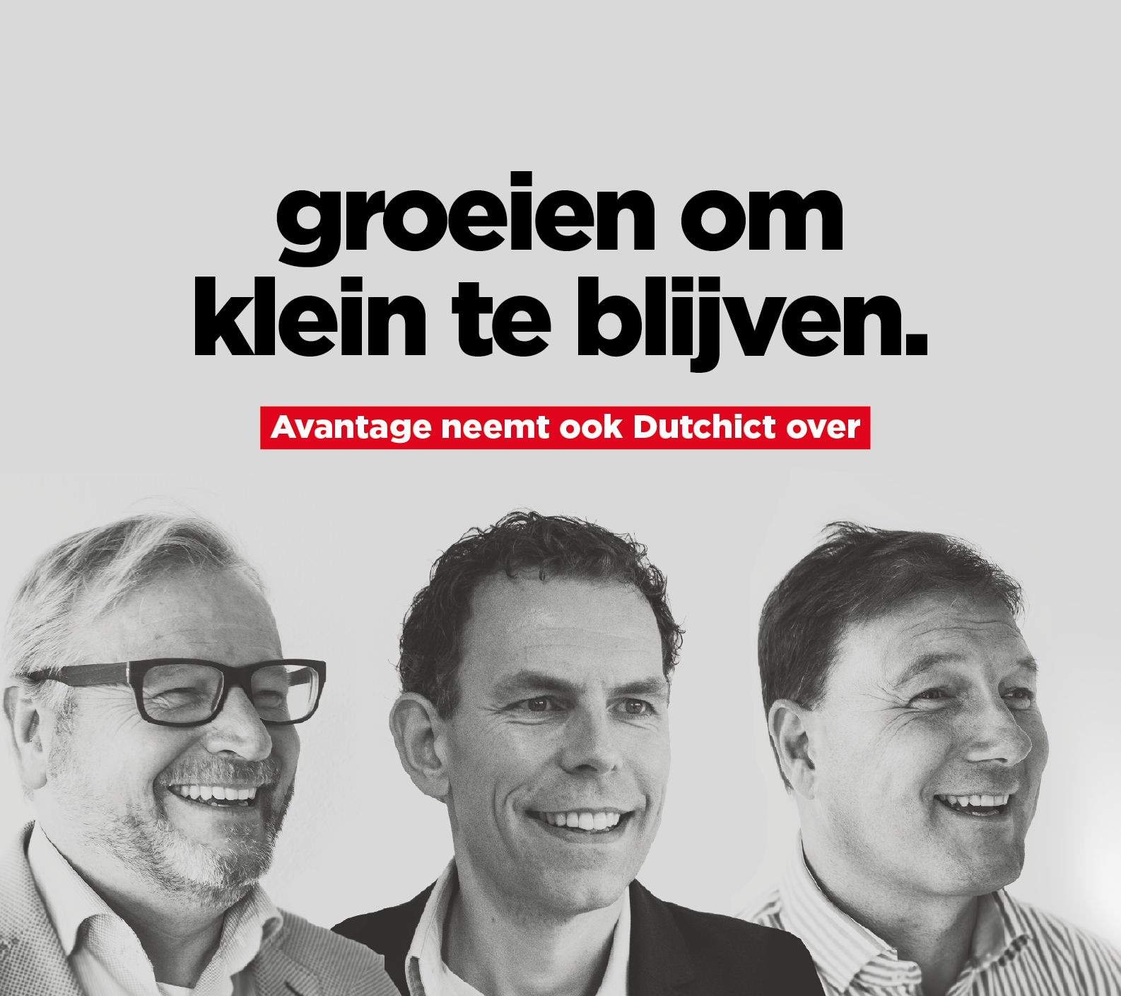 Na de overname van The Data Caretakers aan het eind van vorig jaar, heeft de Rotterdamse IT-dienstverlener Avantage in januari 2017 Dutchict overgenomen. De activiteiten van Dutchict - met vestigingen in Almere en Wateringen - worden vooralsnog onder de eigen naam voortgezet. Door de bundeling van krachten is een IT-organisatie met meer dan 200 medewerkers ontstaan, waarin alle disciplines aanwezig zijn om klanten met behulp van IT maximaal te ondersteunen bij het ontsluiten van informatie om bedrijfsmatig (nog) beter te presteren.