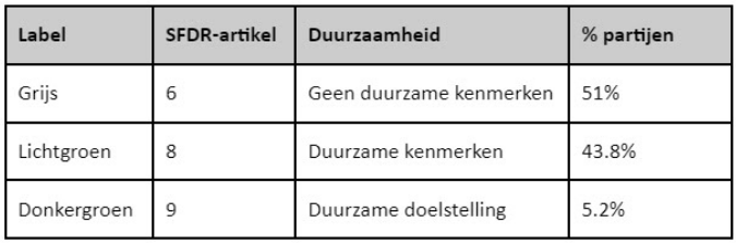 Finner vroeg vermogensbeheerders en banken naar de duurzaamheid van de beleggingen en het beleggingsbeleid. Zij zijn verplicht om aan te geven hoe duurzaam het beleggingsbeleid is via SFDR-artikel 6, 8 of 9. Op dit moment heeft 51 procent van de partijen geen beleggingen met duurzame kenmerken. Er zijn maar vijf partijen met een portefeuille met een duurzame doelstelling.