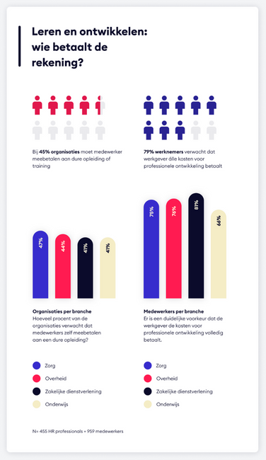 Bij zorgorganisaties wordt het meest verwacht dat medewerkers zelf meebetalen aan een dure opleiding (47%), gevolgd door overheid (44%), zakelijke dienstverlening en onderwijs (41%). Onderwijsmedewerkers zelf verwachten het minst vaak geld van hun werkgever te krijgen voor opleidingen. Bij 66% van de onderwijsmedewerkers is er wel een duidelijke voorkeur dat de werkgever de kosten voor professionele ontwikkeling volledig betaalt. Op afstand gevolgd door zorg (75%), overheid (76%) en zakelijke dienstverlening (81%).