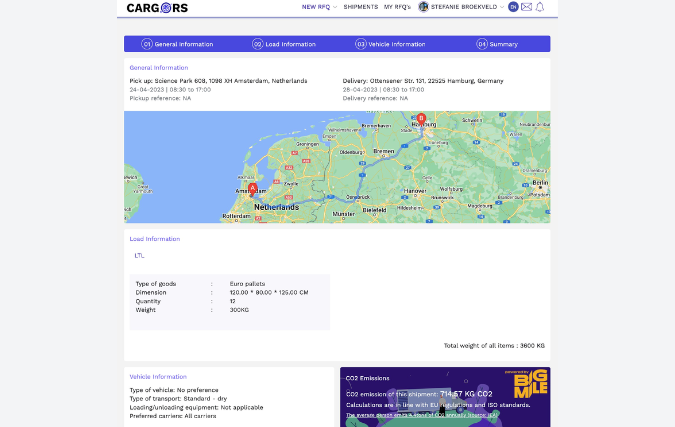 Cargors is in zijn portal niet alleen transparant over prijzen, maar voegt daar nu dus ook informatie over CO2-uitstoot per zending aan toe. De verlader geeft de opdracht in en binnen enkele seconden geeft het systeem enkele alternatieven en kan een zending direct worden aangemaakt. De verwachte CO2-uitstoot wordt ook meteen weergegeven.