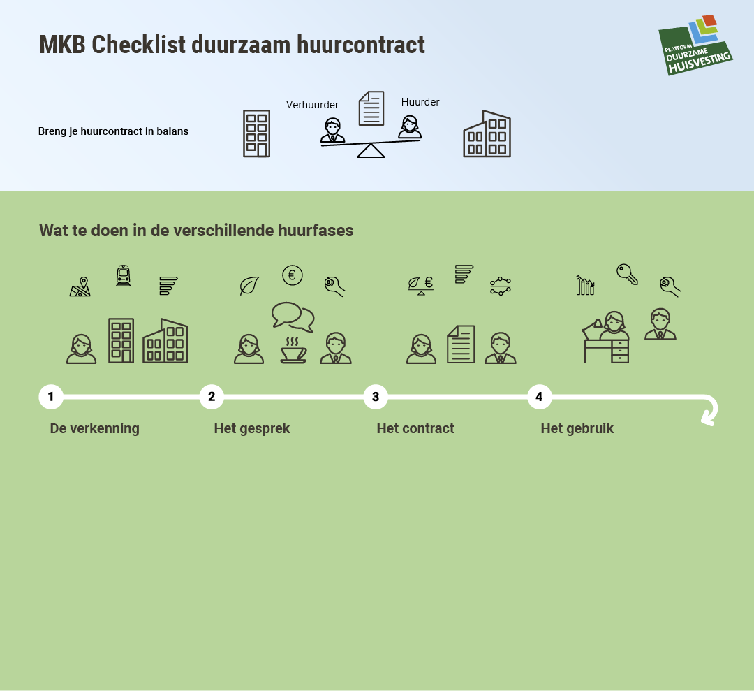 Speciaal voor huurders (100 tot 250 medewerkers) is er een stappenplan ontwikkeld: De MKB Checklist duurzaam huurcontract. Deze checklist helpt huurders de juiste vragen op het juiste moment tijdens de verschillende huurfases te stellen en brengt zo een goede balans in huurcontracten.