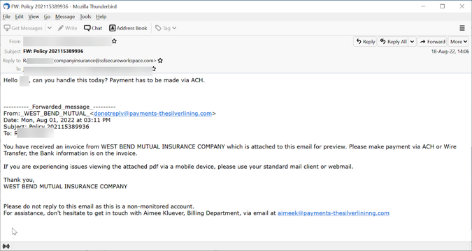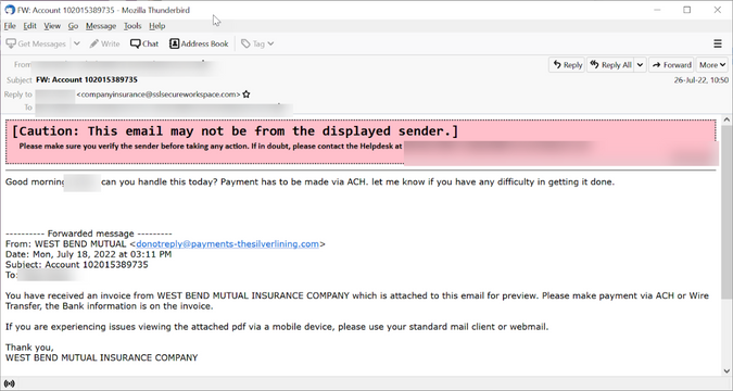 De gebruiker krijgt een e-mail van de CFO met de vraag om een betaling te doen aan een legitieme verzekeringsmaatschappij, West Bend Mutual. Sluw is het feit dat de URL in het 'from'-adres gebaseerd is op de slogan van de verzekeraar. Dit is echter duidelijk nep, aangezien het "reply-to" adres bovenaan de e-mail afwijkt van het e-mail adres van het bedrijf. Wat opvalt is de roze banner die laat zien dat de e-mail niet van de getoonde afzender afkomstig is. Dit werd toegevoegd door de Office 365 van de gebruiker, niet door Proofpoint. Deze banner was het enige dat de gebruiker waarschuwde dat er iets mis was.