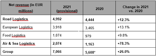 De business line European Logistics zag zijn omzet met een indrukwekkende 13,1 procent stijgen tot 3,92 miljard euro. Na enkele jaren van stagnatie steeg het aantal zendingen aanzienlijk met 6,8 procent tot 72,0 miljoen; de tonnage steeg zelfs nog meer, namelijk met 8,5 procent, tot 30,0 miljoen. Alle regionale business units — Duitsland, Noord-Centraal Europa, Frankrijk & Maghreb en Iberia — boekten dubbelcijferige omzetstijgingen. Ondanks de COVID-gerelateerde beperkingen voor restaurants en hotels in Duitsland, zorgden nieuwe klanten ervoor dat de business field Food Logistics een omzetgroei van 9,8 procent realiseerde. Het is de eerste keer dat de business line de grens van één miljard overschrijdt, met een omzet van 1,07 miljard euro.