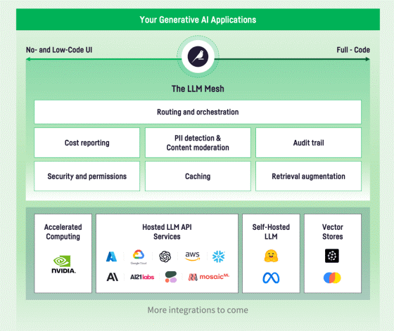 De LLM Mesh bevat onder andere universele AI-service routing, veilige toegang en auditing voor AI-diensten, veiligheidsvoorzieningen voor het screenen van privégegevens en responsmoderatie, en het bijhouden van prestaties en kosten. De LLM Mesh biedt ook standaardcomponenten voor applicatieontwikkeling om kwaliteit en consistentie te garanderen en tegelijkertijd de controle en prestaties te leveren die een organisaties mag verwachten.