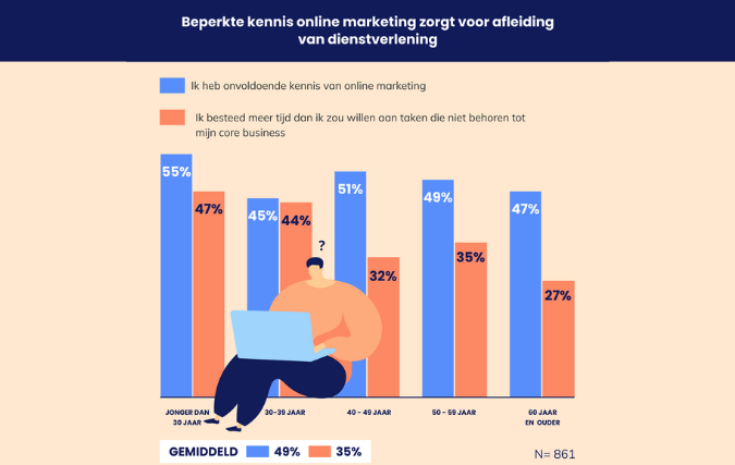 Verder blijkt uit het onderzoek dat maar liefst 49 procent van de respondenten niet voldoende kennis heeft van online marketing. Mogelijk dat hierdoor marketingtaken langer duren dan gehoopt. Zo besteedt gemiddeld 35 procent van de Nederlanders met een eigen bedrijf meer tijd dan ze zouden willen aan taken die niet behoren tot hun core business. Vooral respondenten jonger dan veertig jaar worstelen hiermee (45 procent); onder veertigplussers bedraagt dit percentage 32 procent. Freriks: “Voor goede online marketing en het creëren van zichtbaarheid is expertise nodig, want iedereen vecht voor zijn plekje. Zelfs op lokaal niveau. Dit hoeft niet per se duur te zijn, maar het kost wel tijd en aandacht. Ik begrijp heel goed dat ondernemers zich volledig willen richten op hun dienstverlening, maar commercie is cruciaal voor de toekomstbestendigheid van elke organisatie. Hier is online marketing tegenwoordig een vast onderdeel van.”