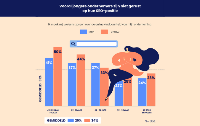 Vooral jonge ondernemers zijn niet blij met hun positie op het internet. Zo is maar liefst 42 procent van de respondenten jonger dan dertig jaar ontevreden over de online zichtbaarheid van zijn organisatie, terwijl het succes daarvan volgens 41 procent van hen grotendeels afhankelijk is van online marketing. Onder veertigplussers bedragen deze percentages 36 en 26 procent. “Consumenten zoeken vooral online als ze iets nodig hebben, ook op lokaal niveau”, zegt Lars Freriks, medeoprichter van Trustoo. “Mond-tot-mond communicatie is altijd belangrijk geweest voor kleine tot middelgrote dienstverleners, wat in de afgelopen twee coronajaren grotendeels is weggevallen. Hierdoor is online zichtbaarheid nog belangrijker geworden, maar het is niet vreemd dat kleine ondernemers nog niet zo ver zijn als gehoopt.”