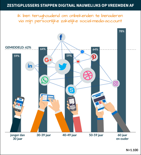 De mate van succes hangt niet alleen af van de digitale handdruk, maar ook hoe mensen zich online profileren. Waar dertigers (elf procent) hun successen op carrièregebied weleens overdrijven, zijn zestigplussers (twee procent) veel bescheidener over hun werkprestaties. Maar liefst 36 procent van hen zit dan ook niet te wachten op connectieverzoeken van vreemden, terwijl twee derde van de jongeren daar wel voor open staat. Spek: “Dat jonge mensen via LinkedIn nieuwe klussen binnenhalen, laat zien dat Nederland klaar is voor digitaal netwerken. Daarbij kan een beetje branie in mijn ogen geen kwaad, al moet je uitkijken dat je niet de verkeerde verwachtingen schept. Als je twijfelt of je iets moet delen op LinkedIn, helpt het om altijd de informatiebehoefte van je doelgroep in het achterhoofd te houden. Dan zit je in ieder geval goed.”