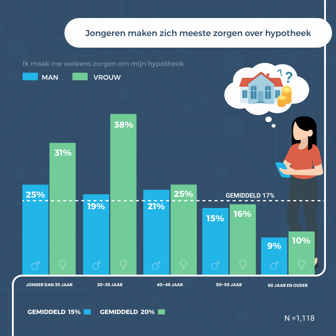 Maar liefst zeventien procent van alle Nederlanders met een koopwoning maakt zich weleens zorgen over zijn hypotheek. Dit blijkt uit onderzoek van Omniplan onder 1.118 huiseigenaren, uitgevoerd door Panelwizard. Bijna zes op de tien ondervraagden pleiten daarom voor realtime inzicht in hun hypotheekproduct en de impact ervan op hun financiële plaatje.