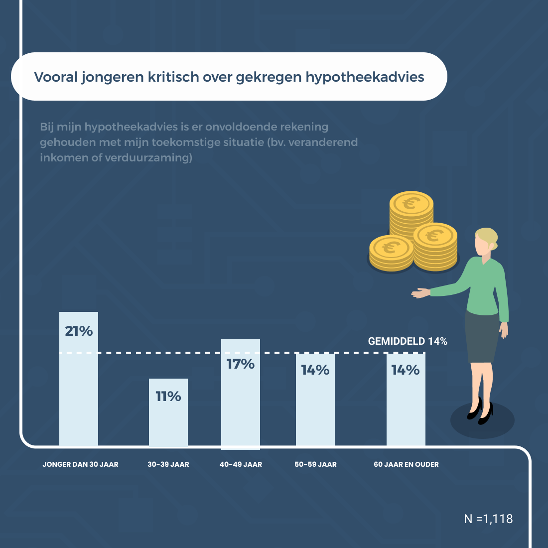 Ondanks dat een aanzienlijk gedeelte van de ondervraagden zich weleens zorgen maakt over hun hypotheek, zegt maar liefst 22 procent van alle huizenbezitters dat zij onvoldoende stilstaan bij de vraag of de financiering op hun huis nog past binnen hun financiële toekomst. Een op de zeven respondenten stelt daarnaast dat er tijdens het hypotheekadvies onvoldoende rekening is gehouden met hun toekomstige situatie, zoals een veranderend inkomen of eventuele verduurzaming van de woning. Boddeus: “De afgelopen jaren hebben aangetoond dat er in korte tijd veel kan veranderen. De hypotheekadviseur van de toekomst beperkt zich daarom niet alleen tot incidentele ondersteuning bij de aanvraag en het afsluiten van een hypotheek, maar geeft zowel op de korte als de lange termijn doorlopend inzicht in ontwikkelingen die van invloed zijn op iemands financiële situatie. Daarbij horen in toenemende mate zaken als verduurzaming en continu inzicht in het netto besteedbaar inkomen. Wanneer je dat over een periode van tien, twintig of dertig jaar uittekent, geef je toekomstbestendig woonadvies.”