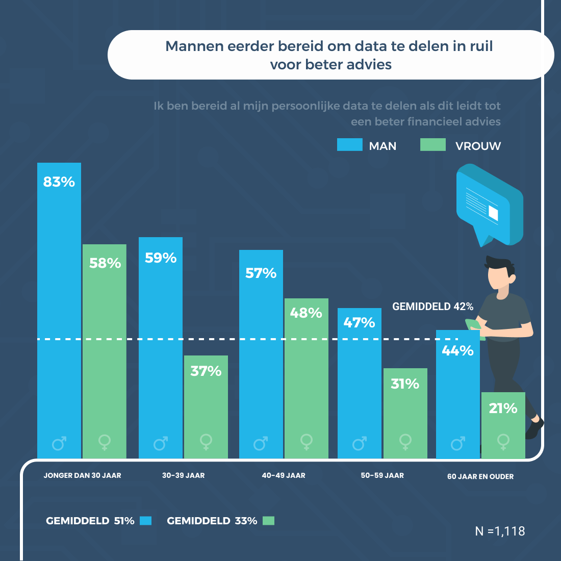 Om woningbezitters van toekomstbestendig woonadvies te kunnen voorzien, is het belangrijk dat hypotheekadviseurs over zoveel mogelijk data beschikken. Uit het onderzoek blijkt dat 42 procent van alle respondenten bereid is zijn persoonlijke data te delen wanneer dit leidt tot een beter financieel advies. Een op de drie van hen zou het zelfs prima vinden als het volledige hypotheektraject (van advies tot daadwerkelijk afsluiten) voortaan volledig digitaal plaatsvindt. Boddeus: “Ondanks dat de consument bereid is om al zijn gegevens te delen, staat data helaas nog steeds op veel verschillende plekken opgeslagen. Het vraagt om verregaande samenwerking binnen de keten om deze data toegankelijk te maken en tegelijkertijd de veiligheid te behouden. Alleen met goed inzicht in betrouwbare data, kun je écht van toegevoegde waarde zijn als woonadviseur.”