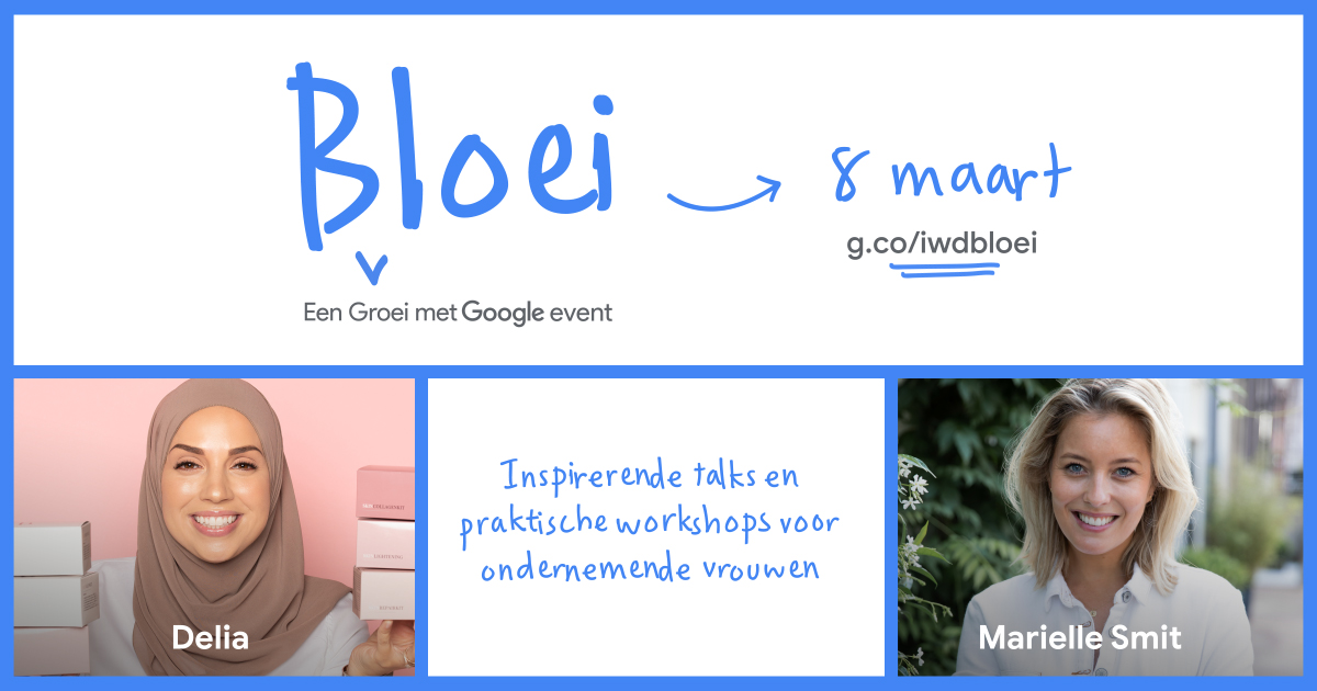 Geef jouw bedrijf, je website of webshop én jezelf een boost! Meld je gratis aan voor BLOEI. Een #groeimetgoogle event voor en door ondernemers. Meld je aan via: g.co/iwdbloei.