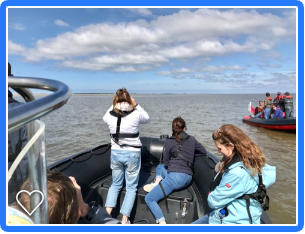 We varen in een RIB, dit staat voor Rigid Inflatable Boat, ook wel Zodiac of powerboat genoemd. Dit betekent dat we niet alleen snel van A naar B kunnen varen, maar ook dat we de vele ondieptes op het Wad prima kunnen bereiken. Een bezoekje aan een zandplaat is dan ook bijna altijd onderdeel van een tocht, evenals het voor anker gaan onder het genot van een hapje en drankje of een bezoekje aan het kleinste Waddeneiland: Schiermonnikoog. En zeehonden spotten doen we natuurlijk ook, als het getij zich daarvoor leent.