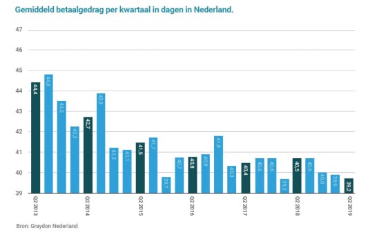 Het algehele Nederlandse bedrijfsleven heeft tijdens het tweede kwartaal van 2019 facturen ruim een dag sneller voldaan dan in dezelfde periode een jaar gelden. Daarmee komt het betaalniveau weer uit op het record dat genoteerd werd in het begin van 2018.
