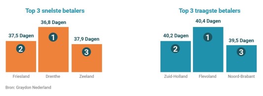 Op provinciaal niveau zien we dat facturen in Drenthe, gemiddeld het snelst werden betaald. Daarmee streeft Drenthe met 36,8 dagen Friesland en Zeeland voorbij. In Zeeland (37,9 dagen) betaalden bedrijven tot voor kort steevast het snelst.