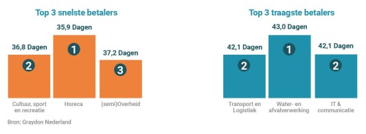Op sectorniveau valt in de Graydon Barometer Betaalgedrag af te lezen dat facturen in de Horeca met 35,9 dagen momenteel het snelst betaald worden. Daarna volgen Cultuur, sport en recreatie met 36,8 dagen en de (semi)Overheid met 37,2 dagen.
