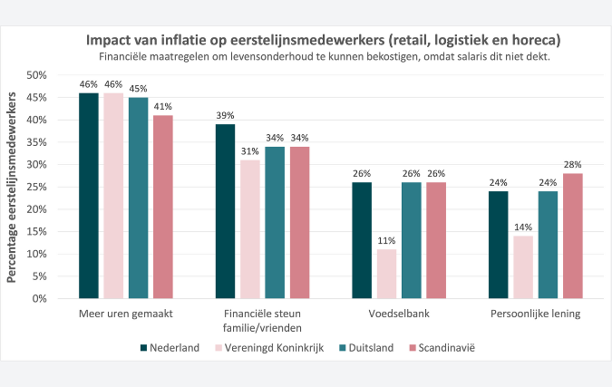 Een kwart van de eerstelijnsmedewerkers in Nederland en Duitsland heeft een persoonlijke lening afgesloten. In Scandinavië ligt dit percentage net iets hoger (28 procent) en in het Verenigd Koninkrijk juist iets lager (14 procent). De reden van deze lening is omdat het huidige loon de kosten van levensonderhoud niet dekt.