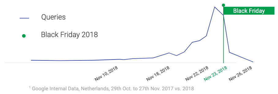Zoals je in de onderstaande afbeelding kunt zien, begint de consument al een week voor Black Friday met haar oriëntatiefase. Wat wil ik kopen? Zijn er al deals bekend? En waar kan ik de beste deal scoren? Zorg daarom dat je campagnes al een week voor Black Friday live gaan, zodat je op het belangrijkste moment zichtbaar bent. Start je pas met je campagnes op Black Friday zelf? Dan is het opboksen tegen de grote jongens die, waarschijnlijk, een groter budget klaar hebben staan dan jij.