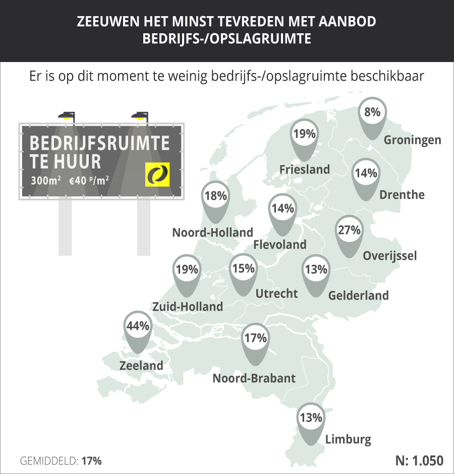 Uit het onderzoek blijkt verder dat zeventien procent van de respondenten ontevreden is over het huidige aanbod in beschikbare bedrijfs- en/of opslagruimte. Daarnaast vinden veel ondernemers de ruimtes die wél beschikbaar zijn, in veel gevallen te duur. Maar liefst dertig procent van de ondervraagden stelt daarom dat er momenteel een tekort is aan betaalbare bedrijfsruimte. Venema: “Het beperkte aanbod zorgt ervoor dat ondernemers creatiever moeten zijn en outside-the-box moeten denken. Gelukkig beschikken ondernemers vaak over een goed probleemoplossend vermogen en zijn oplossingen (zoals een garagebox) tegenwoordig een zeer aantrekkelijke optie.”