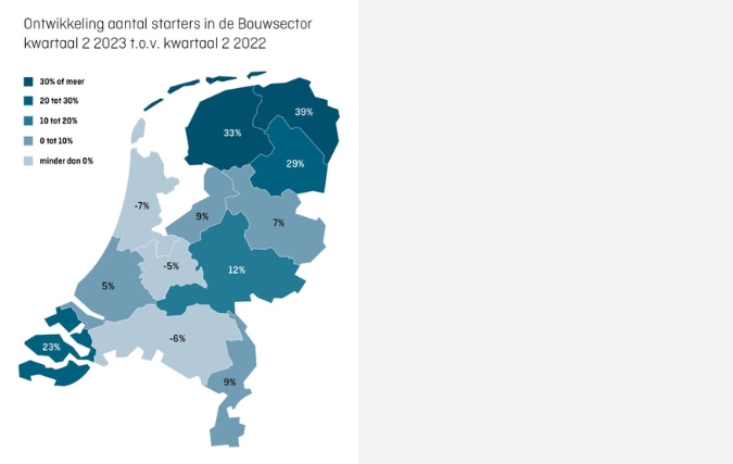 Geografisch gezien is het opvallend dat er in Nederland als geheel een minder sterke groei in het aantal starters in de bouw is, maar dat er in de noordelijke provincies en in Zeeland juist een forse toename is. Groningen +39%, Friesland +33%, Drenthe +29%, Zeeland +23%.