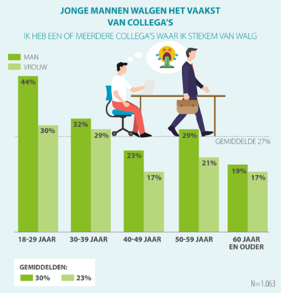 Maar liefst 27 procent van alle werkende Nederlanders heeft ten minste één collega waar hij of zij stiekem van walgt. Dit blijkt uit onderzoek van Acties.nl onder 1.063 Nederlanders werkzaam in loondienst, uitgevoerd door Panelwizard. Mede hierdoor beoordeelt een vijfde van alle respondenten de algehele hygiëne binnen hun bedrijf met een onvoldoende.