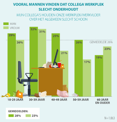 Uit het onderzoek blijkt dat vooral slonzige collega’s schuldig zijn aan de bedenkelijke hygiënische staat waarin veel werkplekken verkeren. Zo zegt maar liefst 26 procent van alle werkende Nederlanders dat hun collega’s de werkvloer over het algemeen slecht schoonhouden. Erg opvallend is daarbij het verschil tussen mannen (28 procent) en vrouwen (23 procent). Ongeacht of ze de werkplek vervuilen, stelt niet minder dan dertig procent van de respondenten dat hun collega’s minder hygiënisch zijn dan zijzelf. Wederom zijn mannen minder te spreken over hun ambtgenoten dan vrouwen: 33 procent tegenover slechts 26 procent. Franke: “Wie ruimt de lunchtafel op, wie haalt er een doekje door de wasbak en wie ruimt de vaatwasser in? In de eerste weken na de lockdown hadden we binnen ons bedrijf hierover geen duidelijke afspraken gemaakt. Dat betekent in de praktijk dat dezelfde mensen iedere dag staan te poetsen, terwijl de rest wegloopt zonder op te ruimen. Onderling zorgde dit voor veel spanning. Sinds we duidelijke afspraken hebben gemaakt, is het gelukkig gedaan met dit soort smeerpijperij.”