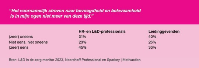 Veel HR- en L&D professionals in de zorg voorzien op korte termijn (1-3 jaar) veel veranderingen in het leerlandschap in de zorg. 71% verwacht dat de samenstelling van het leeraanbod zal veranderen, 69% dat de manier waarop leren en ontwikkelen wordt ingericht zal veranderen en 57% dat de benodigde competenties van zorgmedewerkers zullen veranderen. Verontrustend is het dan ook dat één op de vijf (21%) van de zorgorganisaties nu al vindt dat het enorm achterloopt wat betreft vernieuwing en innovatie op L&D vlak en dat slechts de helft (50%) aangeeft dat het lukt om mee te bewegen met de nodige veranderingen. Dit blijkt uit de L&D in de zorg monitor 2023, uitgevoerd door onderzoeksbureau Sparkey / Motivaction in opdracht van Noordhoff Professional.