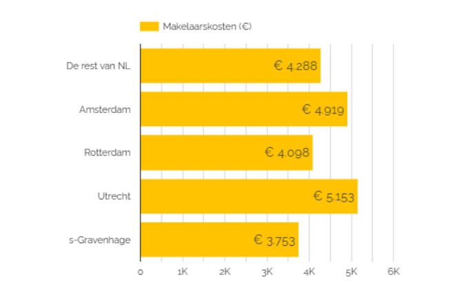 De hoogte van tarieven van makelaars zijn niet in elke stad hetzelfde. Net als vorig jaar, is ook dit jaar Utrecht de duurste stad van de vier grote steden. Utrechtse makelaars rekenen gemiddeld 5.150 euro voor hun diensten. Dat is zo’n 240 euro meer dan een jaar eerder. Den Haag komt als goedkoopste G4-stad uit de bus met een gemiddeld tarief van 3.750 euro.