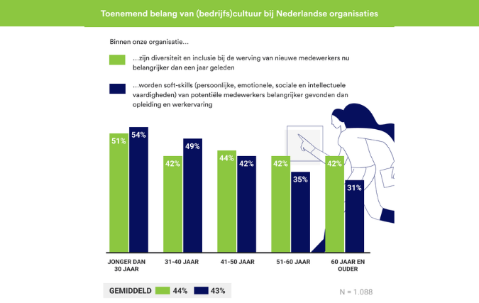 Mogelijk dat meer inzetten op een onderscheidende bedrijfscultuur Nederlandse organisaties helpt met het vinden van het juiste talent. Zo noemt maar liefst 44 procent van de ondervraagde HR-specialisten diversiteit en inclusie belangrijker dan een jaar terug en vindt een even groot deel soft-skills zwaarwegender dan opleiding en werkervaring. Vooral HR-professionals jonger dan dertig jaar zien het belang van ‘D&I’ (51 procent) en persoonlijke vaardigheden (54 procent) binnen hun organisatie toenemen. Onder vijftigplussers bedragen deze percentages 42 en 33 procent. Waaijenberg: “Inzetten op je zogeheten employer brand geeft je organisatie een duidelijk gezicht. Wanneer potentiële werknemers zich daarin herkennen, zullen zij zich eerder bij je aansluiten. Bovendien maakt een match op persoonlijk vlak professioneel samenwerken makkelijker. Zorg daarom voor een authentieke bedrijfscultuur, waarbinnen iedereen zich welkom en gehoord voelt.”