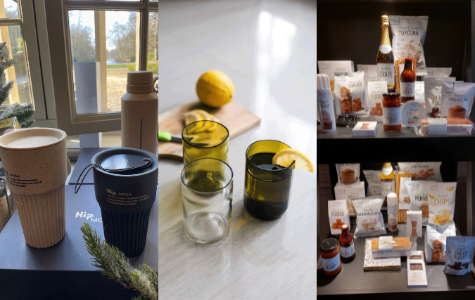 Foto's: serviesgoed van biologisch suikerriet, glazenset van gehalveerde wijnflessen, de witte verpakkingen van Bickery food Group