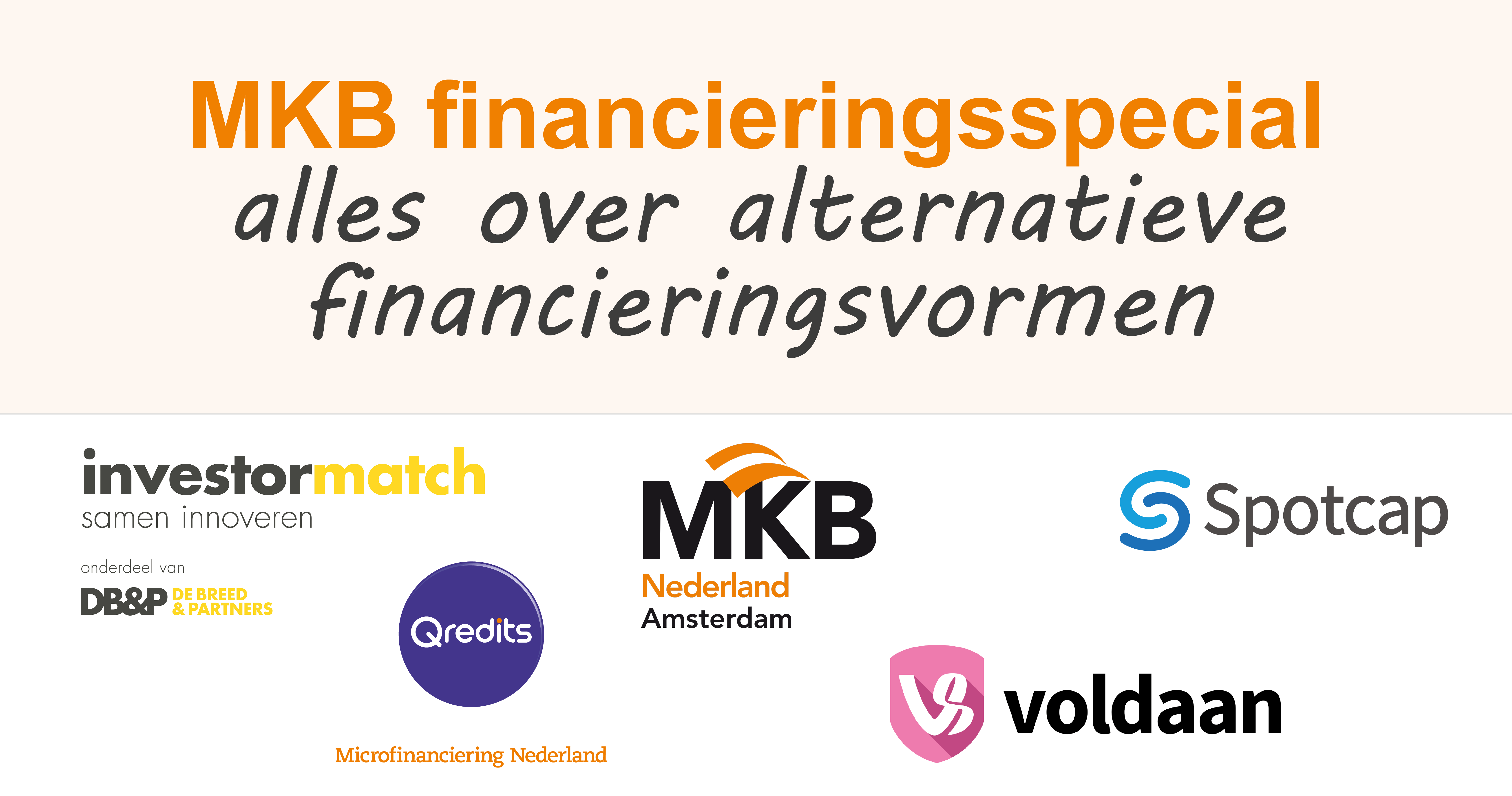 MKB-Amsterdam en Spotcap, Qredits, Investormatch en Voldaan verenigen zich op unieke wijze voor ondernemers en intermediairs in regio Amsterdam door “alles over alternatieve financieringsvormen” te vertellen. Een verrassend initiatief van deze concullega’s binnen de alternatieve financieringsmarkt. Maar wel noodzakelijk zegt Bart Drenth, voorzitter MKB-Amsterdam: “Financiering is één van de belangrijkste vraagstukken voor ondernemers. Daarom is het belangrijk je te verdiepen in de verschillende opties. Tegenwoordig is een lening bij de bank zeker niet meer de enige optie, en in veel gevallen ook niet de beste.”