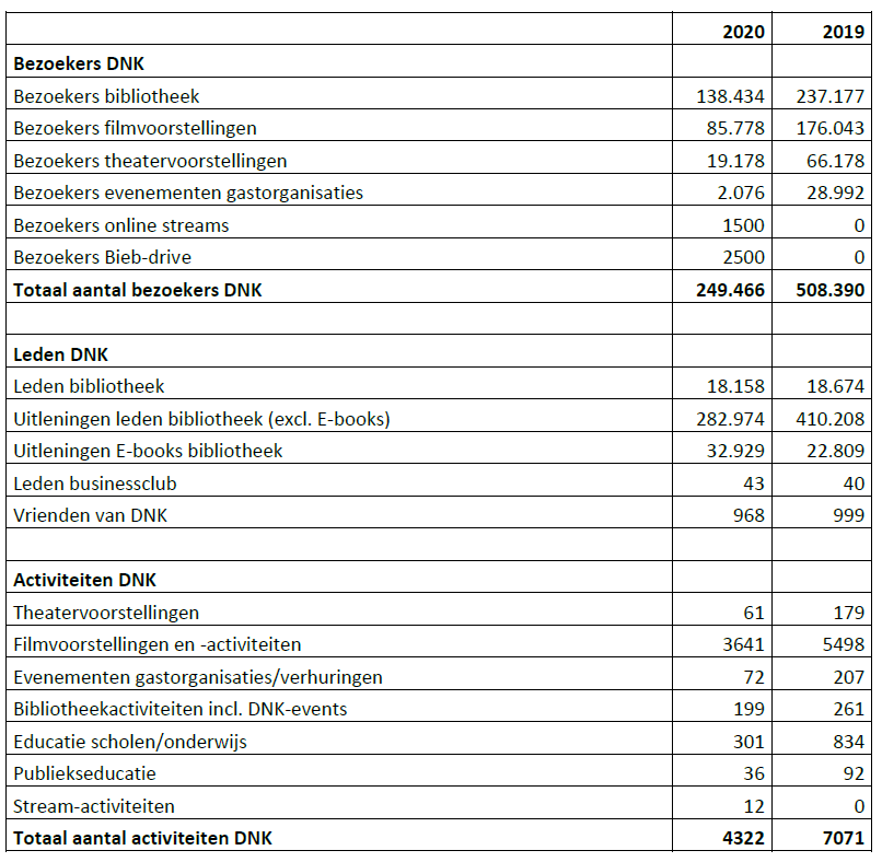 De cijfers in de bijlage geven een goed beeld van de verschuivingen die corona teweeg heeft gebracht. De drastisch gedaalde bezoekerscijfers kunnen deels in perspectief worden geplaatst ten opzichte van de landelijke cijfers. Zo trokken bioscopen in Nederland 55% minder bezoekers t.o.v. 2019. DNK zit door een zeer goed eerste kwartaal op daling van nog geen 50%. Bovendien hebben we bijna 97% van onze Vrienden weten te behouden dit jaar en is het aantal Business Club-leden zelfs gestegen. In lijn met het landelijke corona annuleringsprotocol dat voor de theaterwereld werd gelanceerd, hebben veel klanten het aankoopbedrag van hun tickets gedoneerd.