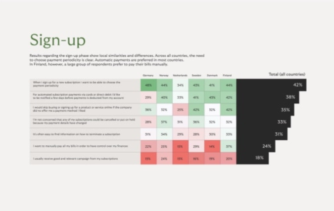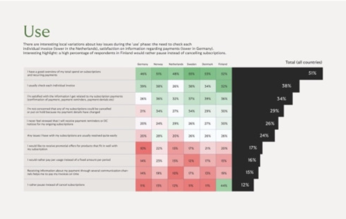 Vanuit het betalingsperspectief zijn betalingsbevestigingen, herinneringen en weigeringen een essentieel onderdeel bij het gebruik van een abonnement. Het is dan ook onthutsend om te zien dat slechts 34 procent van de deelnemers aan het onderzoek op dit punt tevreden zijn. De score voor Nederland ligt hier overigens net onder het gemiddelde. Er moet op dit gebied dus nog veel gebeuren om ervoor te zorgen dat de klantreis zo ongecompliceerd en gemakkelijk mogelijk is. Tot het zover is, zullen er nog veel klanten verloren gaan.