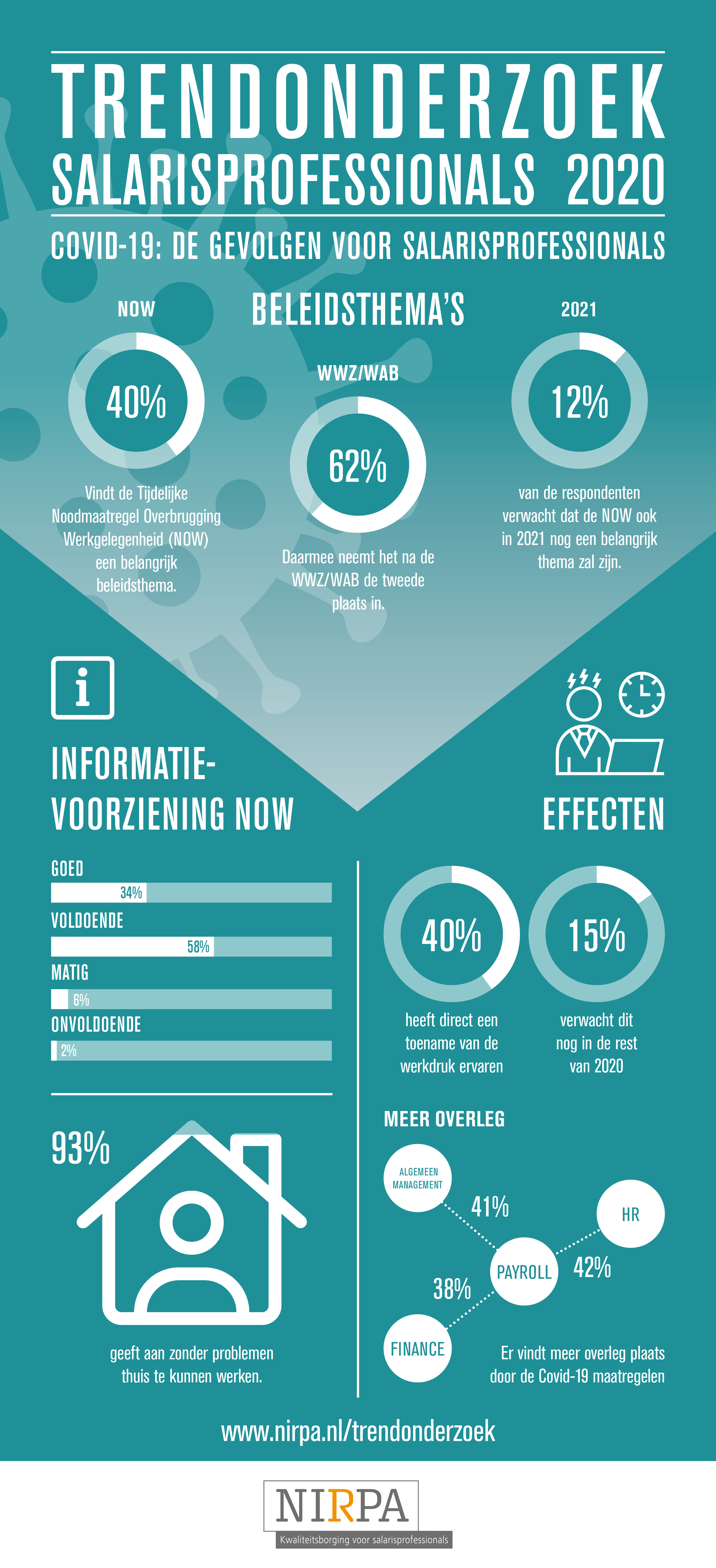 Dat blijkt uit het Trendonderzoek Salarisprofessionals 2020 van het Nederlands Instituut van Register Payroll Accounting (NIRPA), uitgevoerd door Berenschot en uitgegeven door Performa. Aan het onderzoek deden 983 salarisprofessionals mee. Voor de editie van 2020 zijn diverse vragen toegevoegd over de effecten van de Covid-19 maatregelen op de functie van de salarisprofessional.