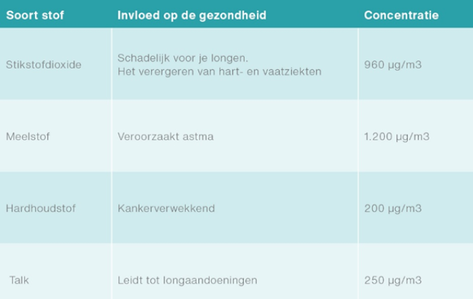 Tot zover de waarden voor de buitenlucht. Want hoe zit het met de binnenlucht? De wettelijke limieten voor binnenlucht liggen aanzienlijk hoger dan voor de buitenlucht. Vergelijk onderstaande cijfers maar eens met de WHO aanbeveling voor buitenlucht: 15 µg/m3. Dat betekent dat je op het werk 20 tot 100 keer meer schadelijke stofdeeltjes inademt dan de WHO aanbeveelt voor de buitenlucht.