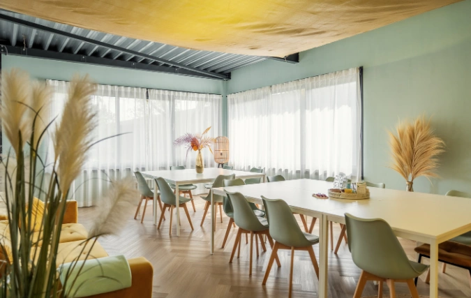 Een warme houten vloer, veel planten, een comfortabele bank en gordijnen die het daglicht zacht filteren... Nee, dit lijkt in niets op een standaard leslokaal of trainingsruimte. Dit is een huiskamer waar je graag verblijft.