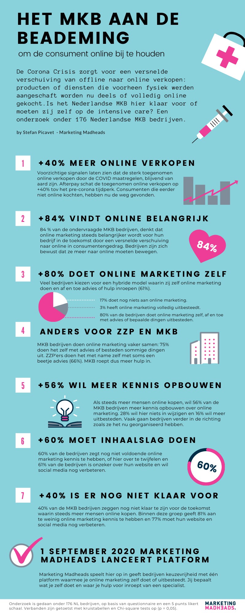 Zo geeft 60% van de bedrijven aan, nog te weinig kennis te hebben van online marketing en 61% geeft aan niet zeker te weten of hun website en sociale media goed genoeg is om de toegenomen vraag van consumenten goed op te kunnen vangen. Om deze reden wil het grootste gedeelte van de ondervraagde MKB bedrijven (56%), zelf meer kennis over online marketing opbouwen en af en toe specialistisch online marketing advies inroepen. Marketing Madheads lanceert hun online marketing platform om juist in deze combinatie te kunnen voorzien.