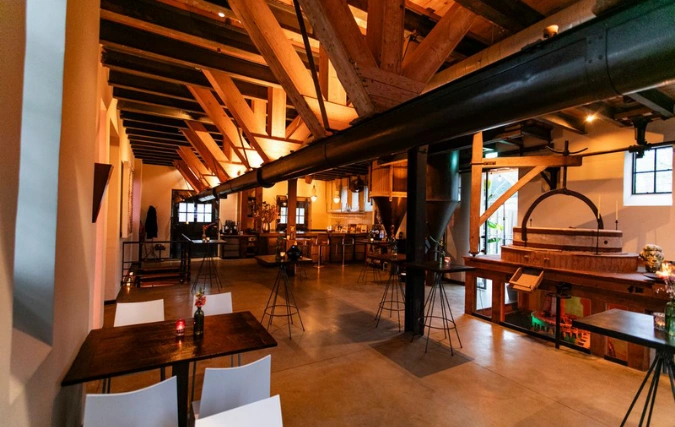 Compleet met oorspronkelijke molensteen, mengsilo’s en nog zichtbare structuren van het waterrad deze locatie ademt verhaal. De verschillende ruimtes in de molen zijn stijlvol verbouwd, hebben karakter en bieden techniek en comfort voor bijeenkomsten tot circa 120 personen. De royale boerenschuur is ideaal voor alles van intieme strategy-sessies tot productpresentaties, teambuilding en workshops.