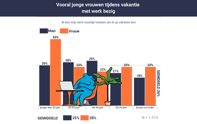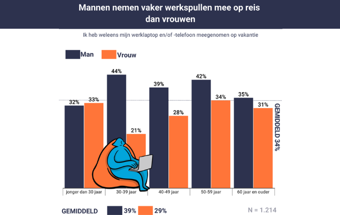 Dat werknemers op vakantie bereikbaar blijven voor ‘de zaak’ is deels hun eigen verantwoordelijkheid. Zo blijkt uit het onderzoek dat maar liefst een derde van de respondenten weleens hun zakelijke telefoon of laptop heeft meegenomen op vakantie. Opvallend genoeg nemen mannen (39 procent) vaker hun werkspullen mee op vakantie dan vrouwen (29 procent). Dit heeft mogelijk als gevolg dat maar liefst een kwart van de werkende Nederlanders het werk moeilijk kan loslaten op vakantie. Jongeren tot dertig jaar (35 procent) hebben hier beduidend meer last van dan zestigplussers (twintig procent). Braun: “Wanneer je jouw werkspullen mee hebt, verlaag je automatisch de drempel om dagelijks je mail en appjes te checken. Op die manier laat je het werk nooit helemaal thuis. Toch kan ik me goed voorstellen dat het even wennen kan zijn om op vakantie niets om handen te hebben en de werkdruk los te laten. Daarvoor heb ik één tip: geef jezelf eraan over en geniet van je welverdiende vakantie.”