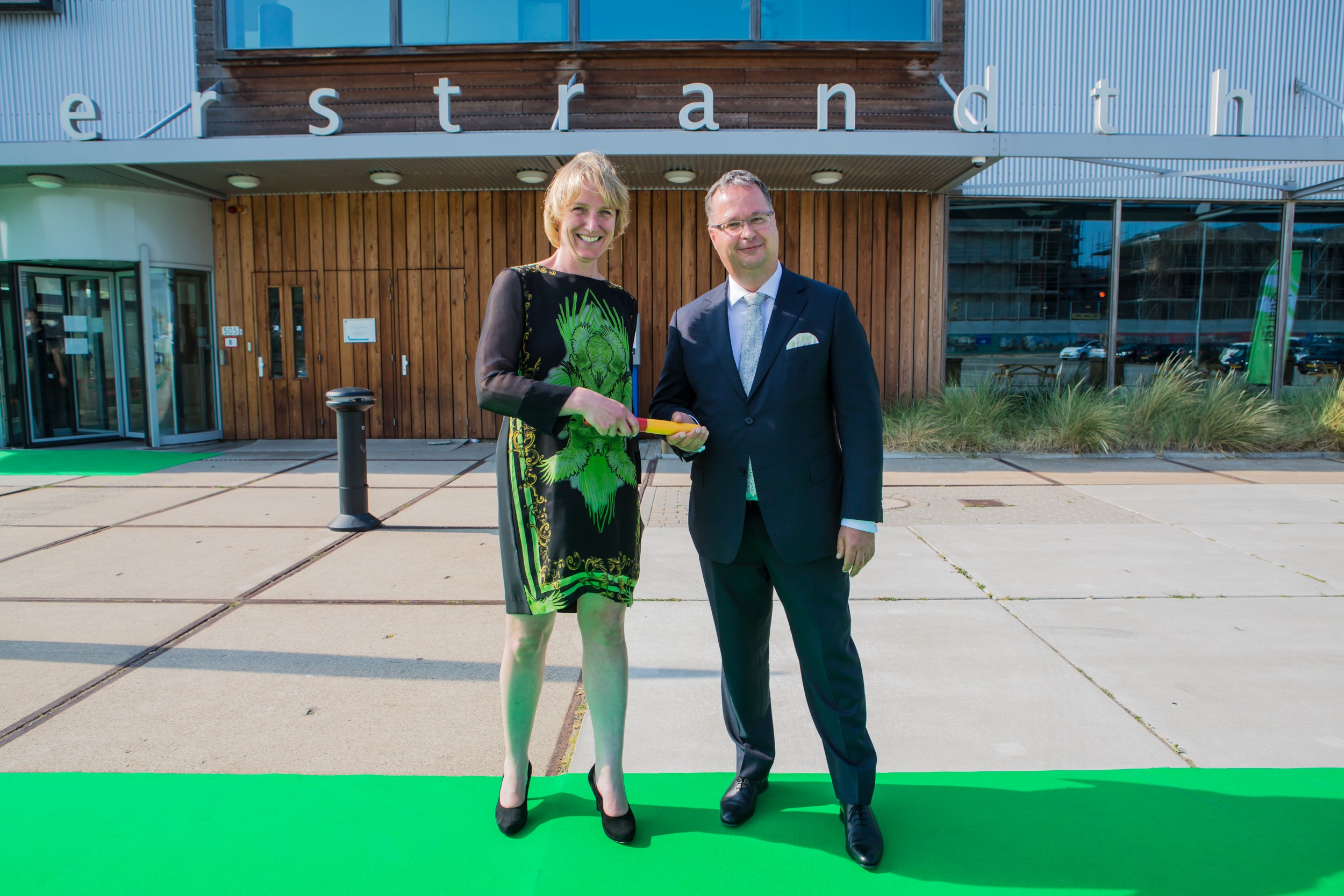 Fotobijschrift: Nienke Vledder, Fondsmanager ENERGIIQ bij Innovationquarter krijgt het estafettestokje overhandigd van Jan Weber, Gedeputeerde Zuid-Holland (Foto: Daniel Verkijk)